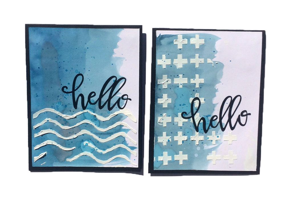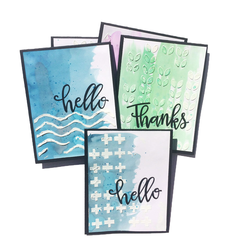 Cut them out of Stencil Plastic and use Whipped Spackle or thick gesso. Swipe the gesso over the stencil and then with a small putty knife wipe off the excess. Pull up the stencil and let the card dry. You’ll have a dimensional design you can watercolor over. (Or watercolor first, then stencil over the top.)