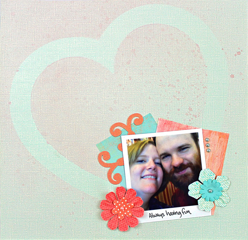 I decided I wanted to create a layout like this for myself, but instead of a giant circle and a ton of embellishments, I wanted an outline of a heart shape. It’s the same kind of curved shape to draw the eye around the page, but I used a custom sprayed background to subtly fill some of the white space. Rather than buy a 12 x 12 background stencil for $5 or more, I cut my own from a piece of Pazzles Stencil Plastic and one of the hearts from the “Handful of Hearts” file in the Craft Room Image Library.