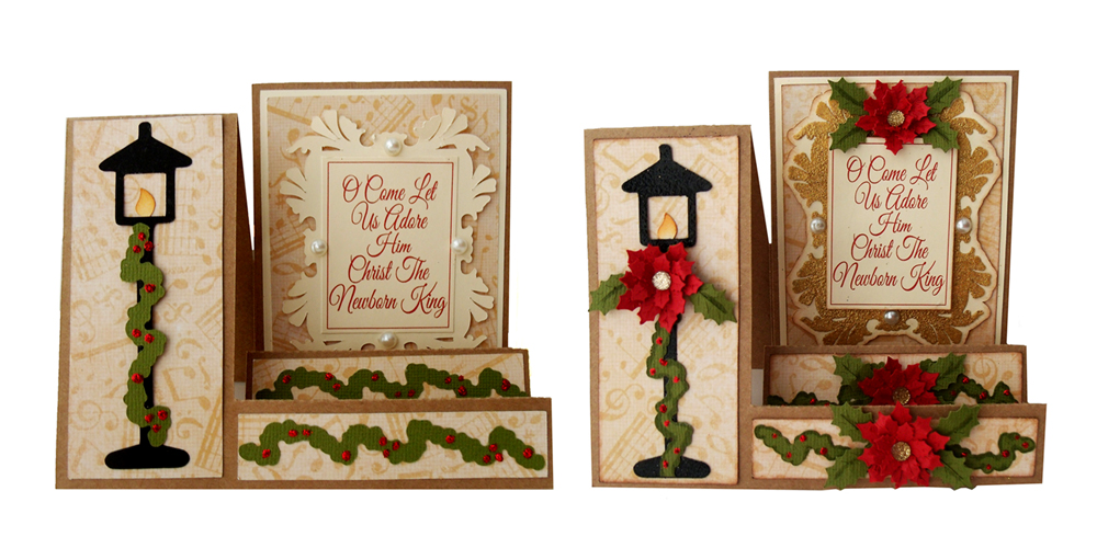 For the main card base, I used the Side Step Fold file from the Craft Room. I cut them both in kraft cardstock. I then used my DCWV Performance stack and found some lovely cream note paper. So I cut a cream mat for the main area of the card and then cut the rest of the mats in the patterned paper. I then turned to the Craft Room Library and found the fun Christmas Lamp file. I cut them out in black cardstock. For the “fancier” version, I took it a step further and embossed it with black embossing powder. If you look at it, you can see how it makes the lamp look a little more “realistic”. I then cut the flames out and inked them to give them a bit of a “glow”. I then cut out the garland and cut extras to line the bottom two steps on each card. I used my red Stickles glitter glue to add the little holly berries. I then turned to my sentiment and typeset my sentiment in my Pazzles software. I then used the print n’ cut feature to print the sentiments out on my printer and then cut them with my Pazzles. For the frames, I grabbed the Flourish file from the Craft Room and made a frame from it. I embossed the frame with Gold embossing powder on the fancier card. For the other card I simply layered the sentiment onto it and then added some pearl accents. I used my foam tape to give it a little lift.