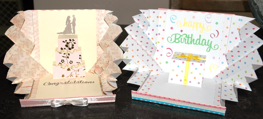 These cards are a very unique exploding plus pop-up card that you can use for a wedding, birthday, or any occasion that involves a present or a cake! I saw this card and was really excited to make it. I have included instructions below to help you assemble it.