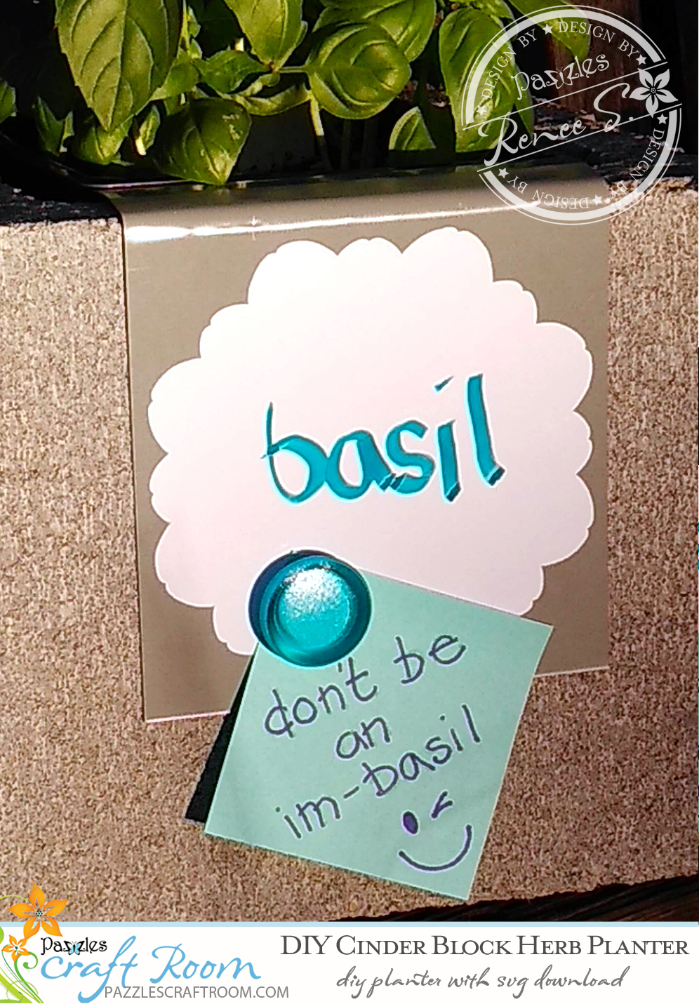 The right side features a magnetic dry erase board so you can date the plant, write its type, or whatever you like, then just erase and start over as needed. This project uses a common 8” x 8” x 16” Standard Cored Concrete Block because it has plenty of space for a good sized basil plant inside one of the holes, which are evenly formed, and has a good smooth look all the way around it, which makes adding the stencil decoration easy.