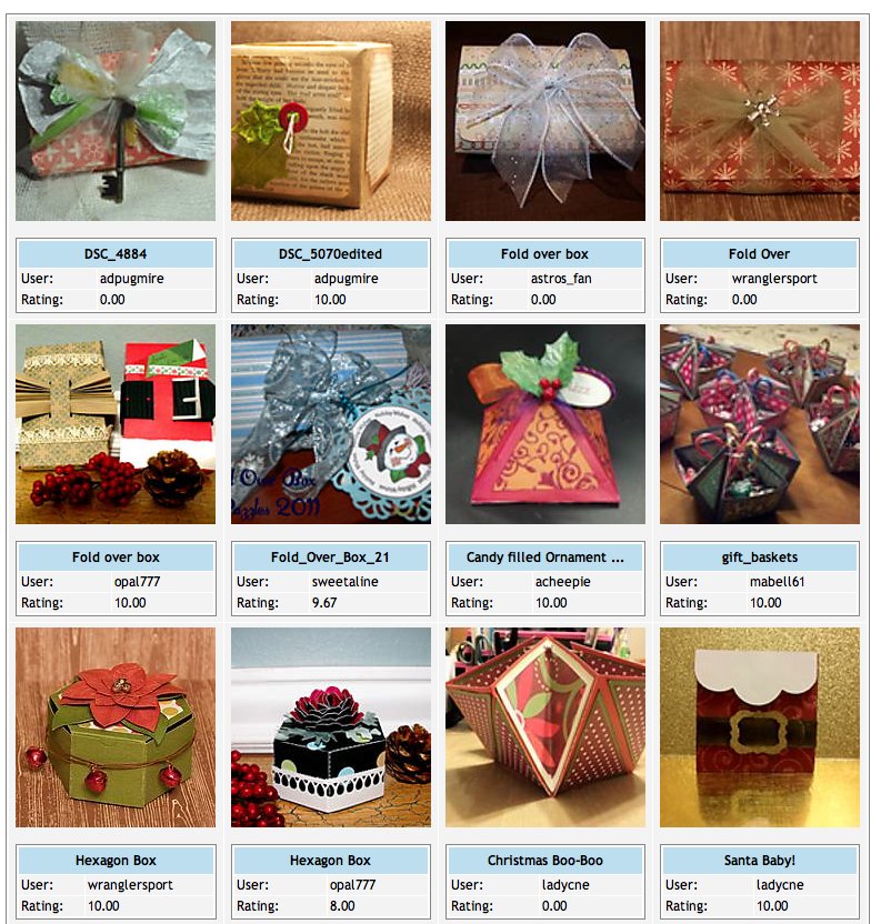 DON'T FORGET, we EXTENDED this Challenge through December 21, 2011 to give you more time to get them done. Read below for more details! Be sure and check out the AWESOME Entries so far (there are almost 100) and REMEMBER, the winners are chosen by RANDOM Drawing. December’s Challenge is going to go hand in hand with the 12 Boxes of Christmas. The challenge will be to make boxes with us as they are posted each day.