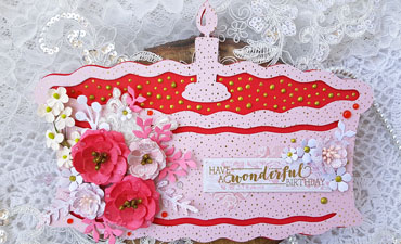 A yummilicious strawberry cake shaped card with exquisite floral details and a gold accents!